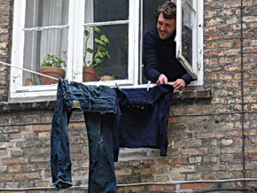自分の部屋と角の部屋とでロープで結びジーンズを干していた??